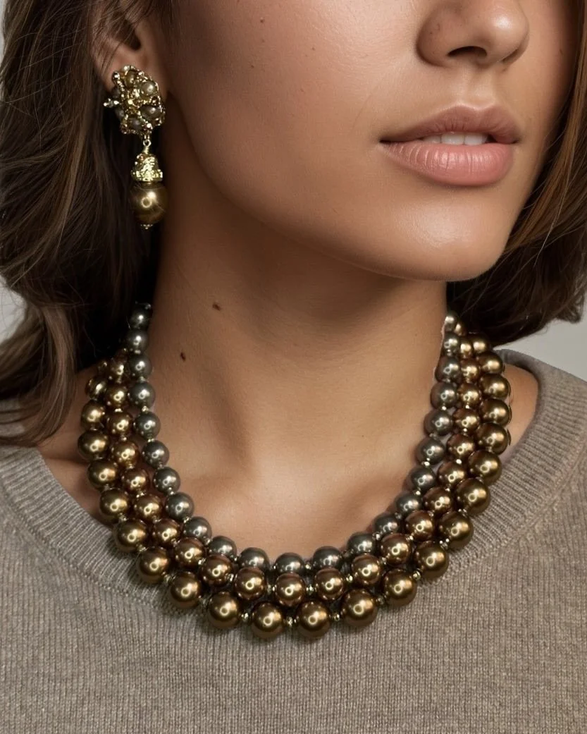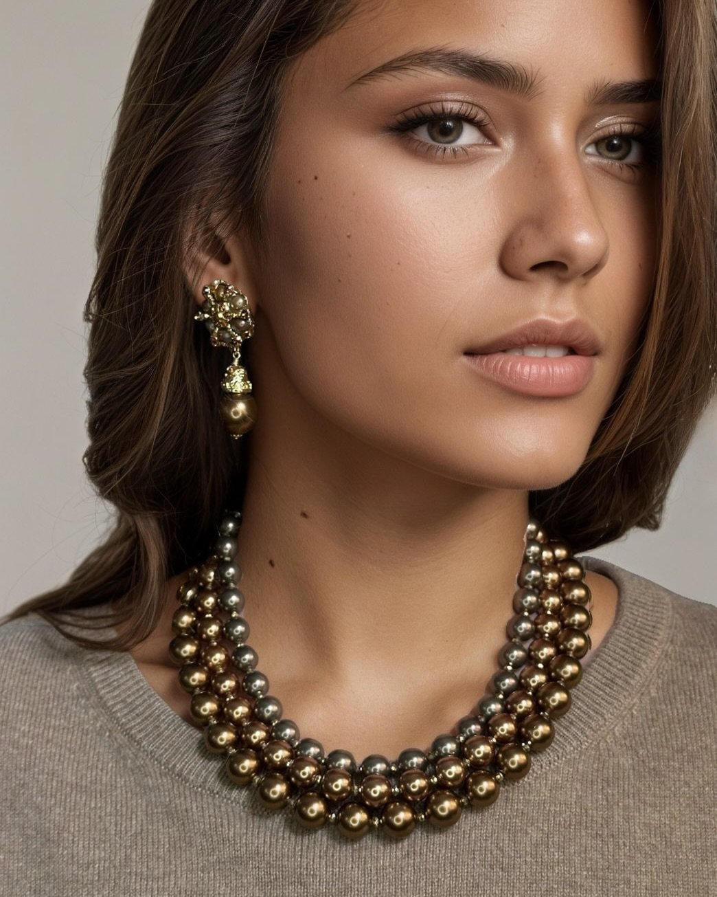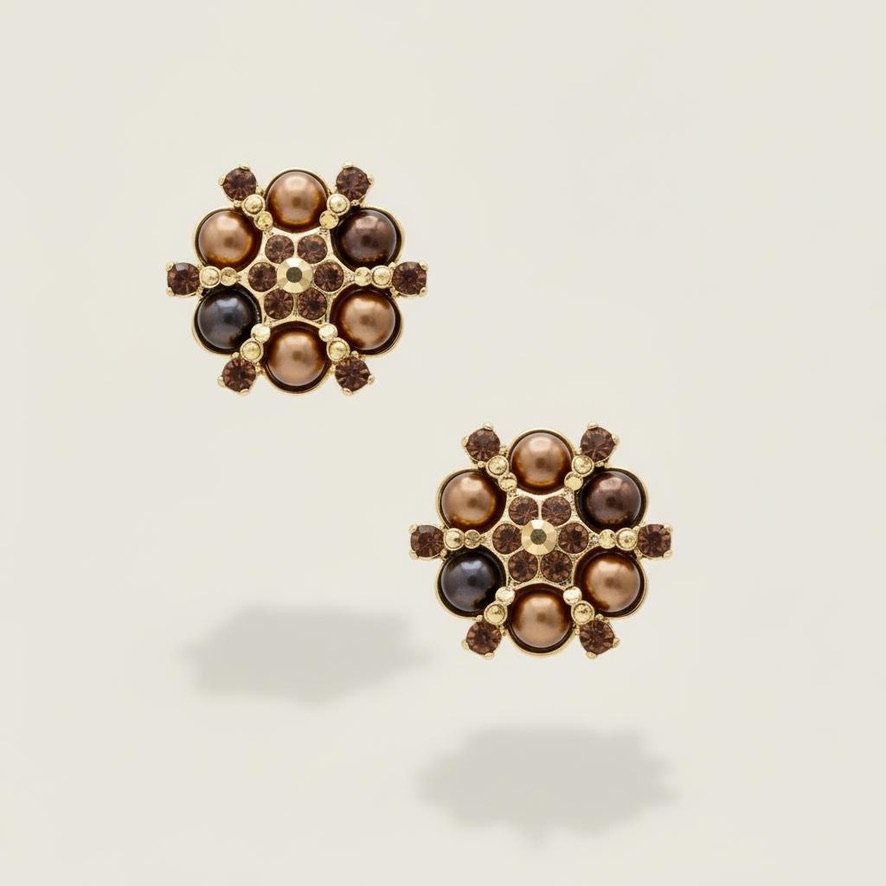 24 Karat gold plated starburst clip earrings with brown fresh water pearls Austrian crystal stones in smoke topaz and gold colors with a brown shell based pearl drop. Earrings measure 2.1/4” long
