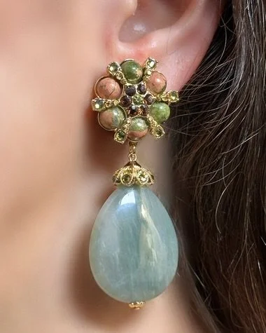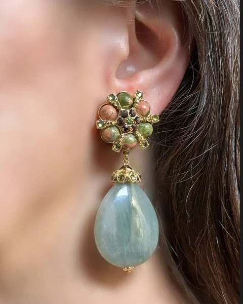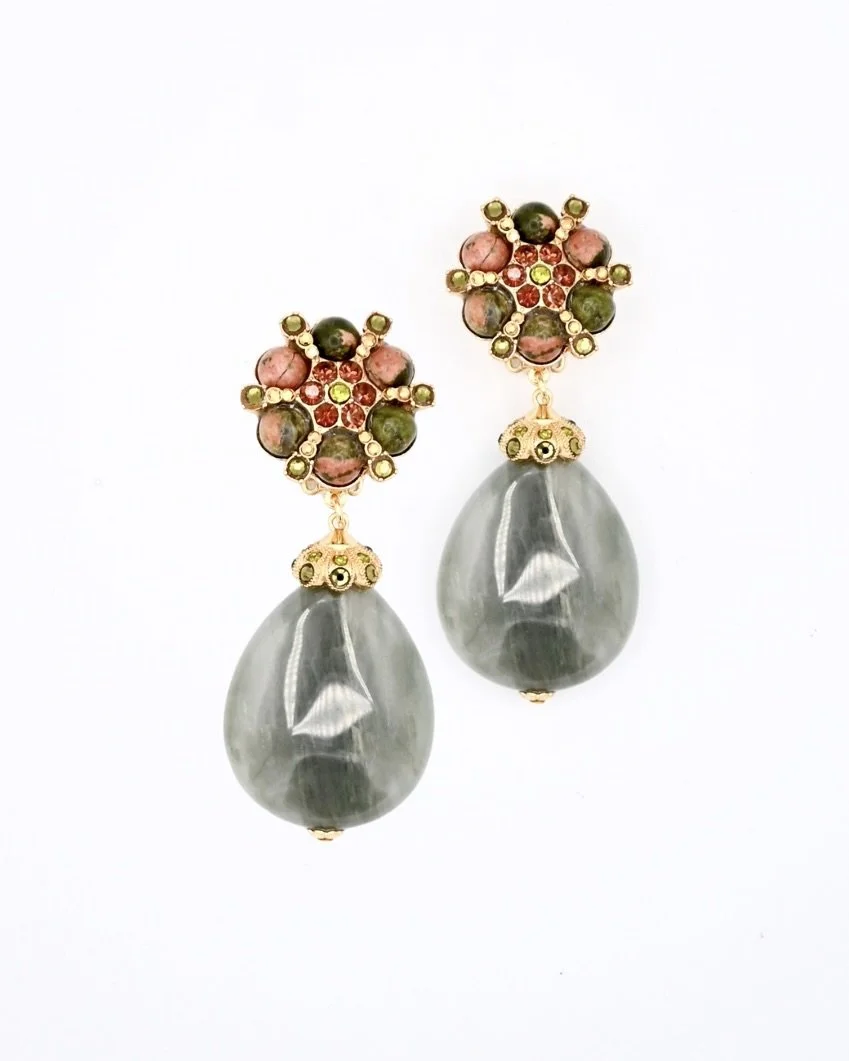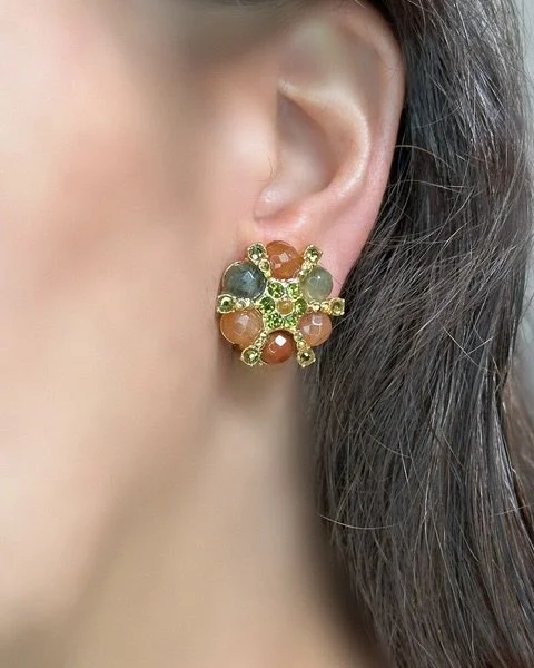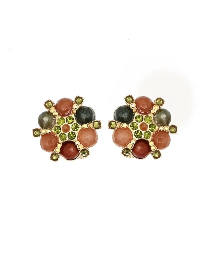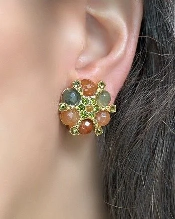 24 karat gold plated starburst shape clip earrings set with beads of multi color rutilated quartz accented with Austrian crystal stones in green. olive and gold suspending a gold plated cap with a natural orange tone fire agate bead drop. All beads are natural and may vary slightly in shade from photo.