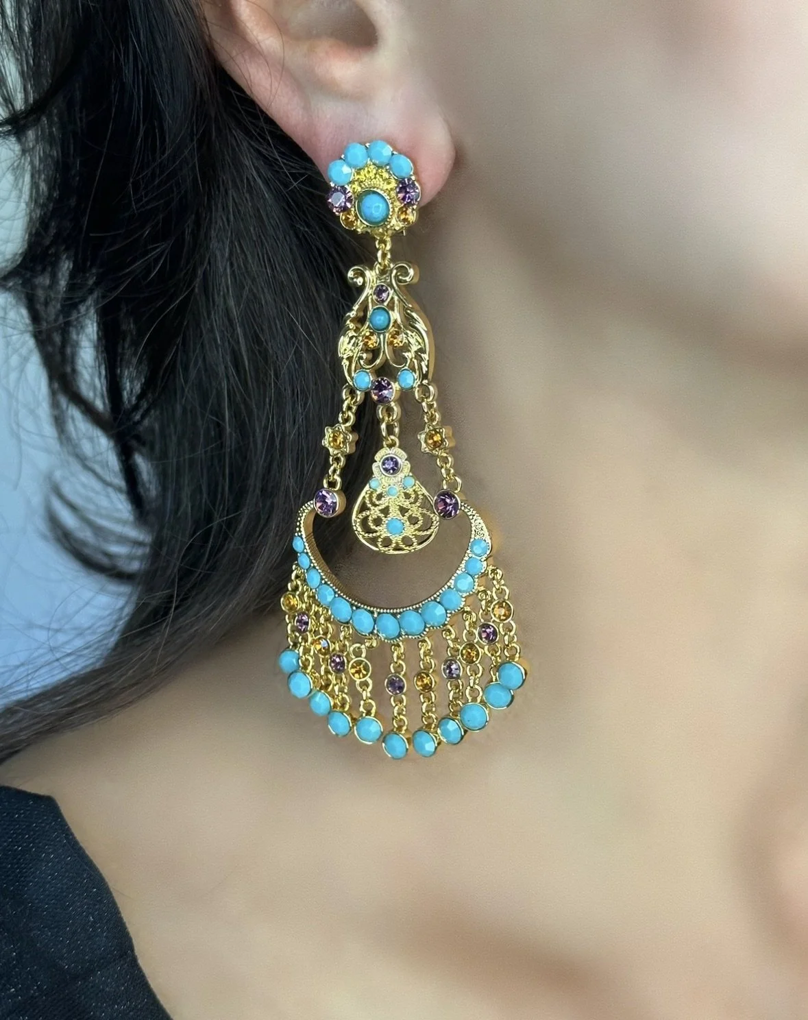 Three strand necklace made of carved and smooth turquoise beads accented with gold plated beads and caps with Austrian crystal accented bail suspending a large statement pendant set with large Austrian crystal stones in colors of amethyst , topaz , turquoise and gold mixed with smooth cabochon stones in genuine turquoise accented with glass turquoise stones. Shortest strand measures 17.5 ” longest strand measures 21” plus 3” chain extender. Pendant hangs 4.5” from bail.