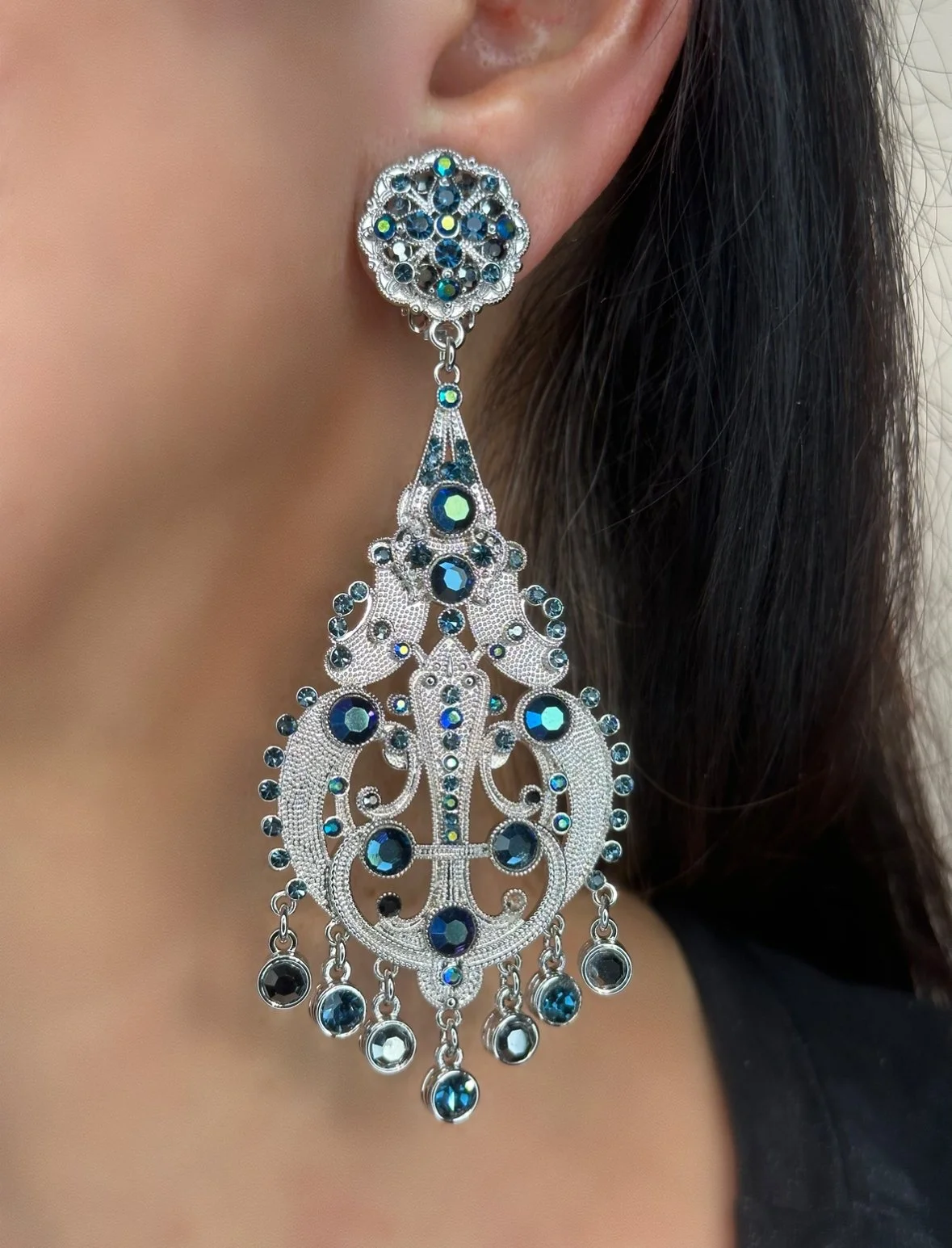 24 kt gold plated starburst cluster clip earring set with a surround of navy blue ( montana blue color ) Austrian crystals, a larger center and edge of clear Austrian crystals. Earrings Measure 1 ” in diameter.