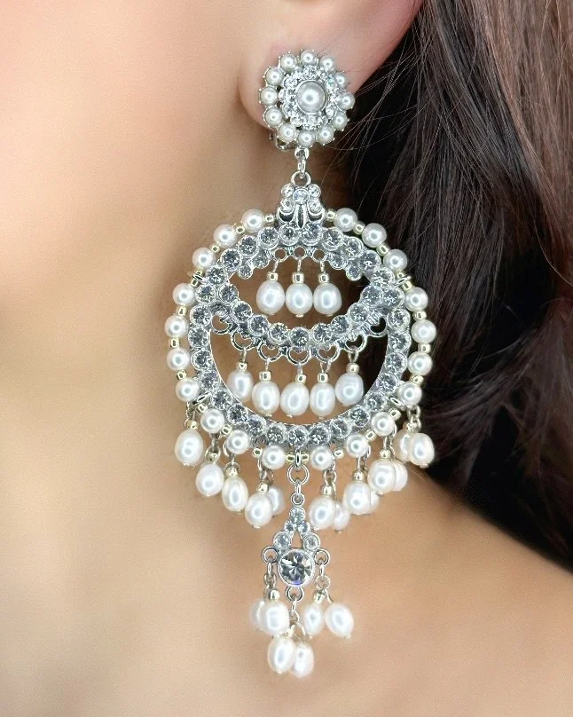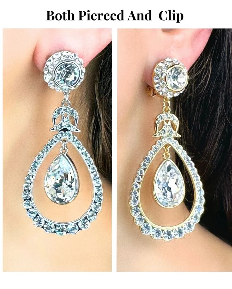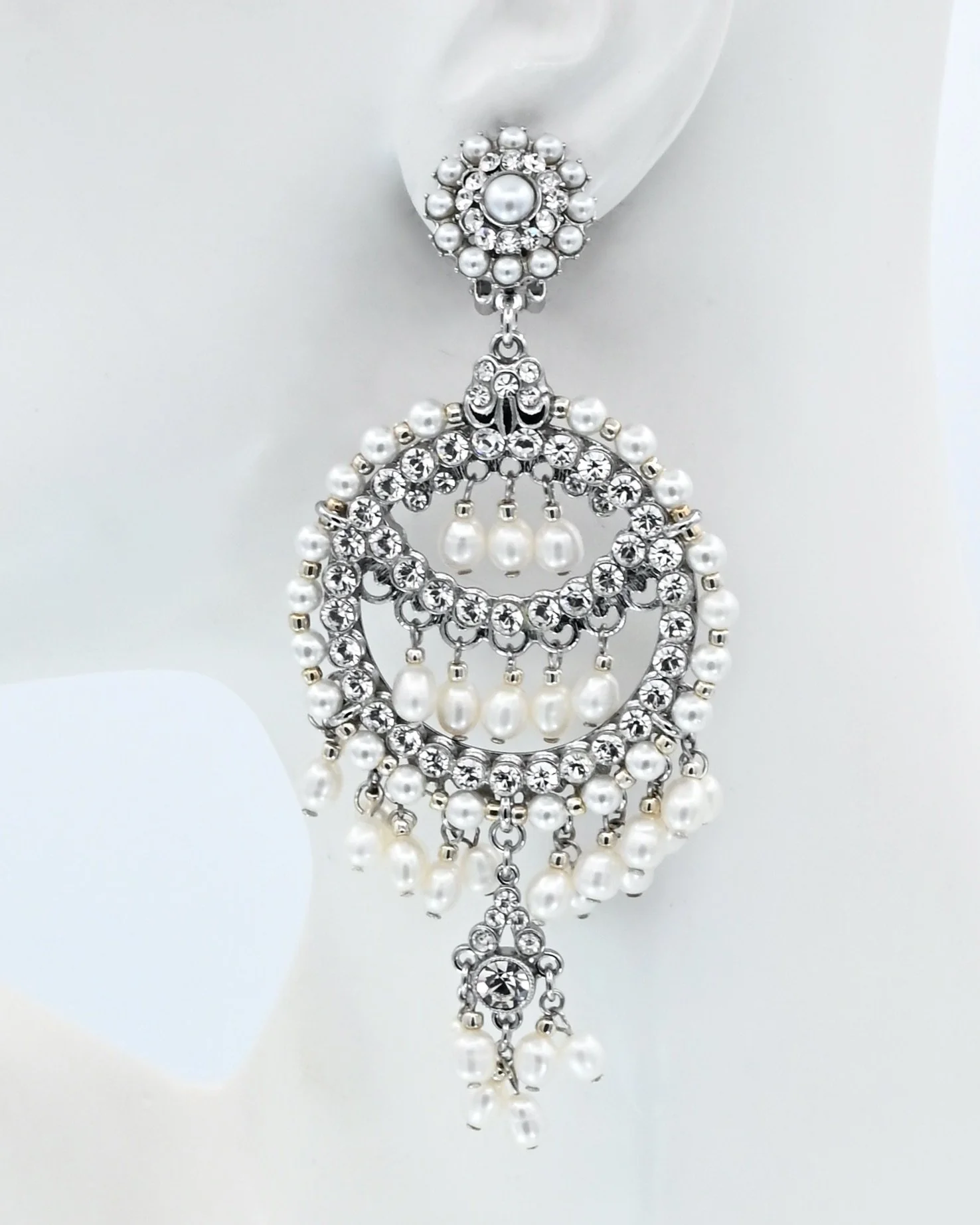 Rhodium Silver plated french wire medallion drop earring with cubic zirconia connector suspending a second floral filagree medallion set with Clear Austrian Crystal stone .Earrings measure 2“ in length and 3/4“ wide.