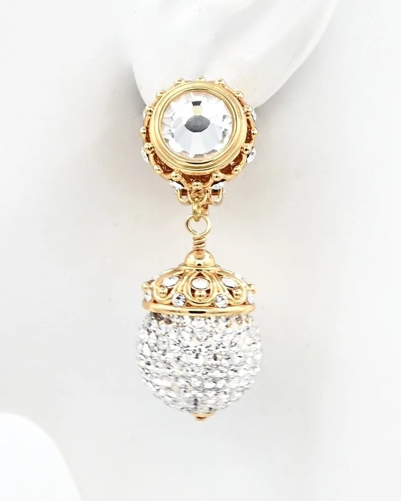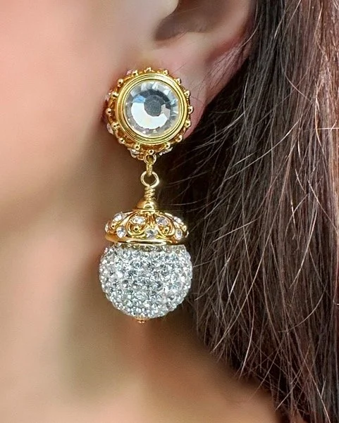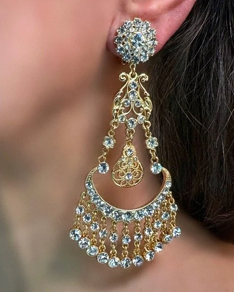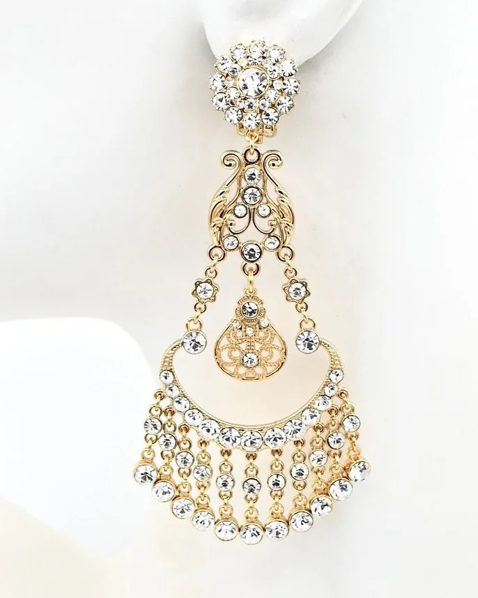 24 Karat gold plate dramatic linear circle linked chandelier Earrings set with Clear Austrian Crystal stones. Earrings measure 4 ” long and 1.5” at the widest part. Earrings are available with a large round crystal with a crystal edge top or a round rosette design in both pierced post-back and clip earring options. These earrings are dramatic while comfortable to wear all evening. Special custom colors may be requested by sending an email to info@larisabarrera.com