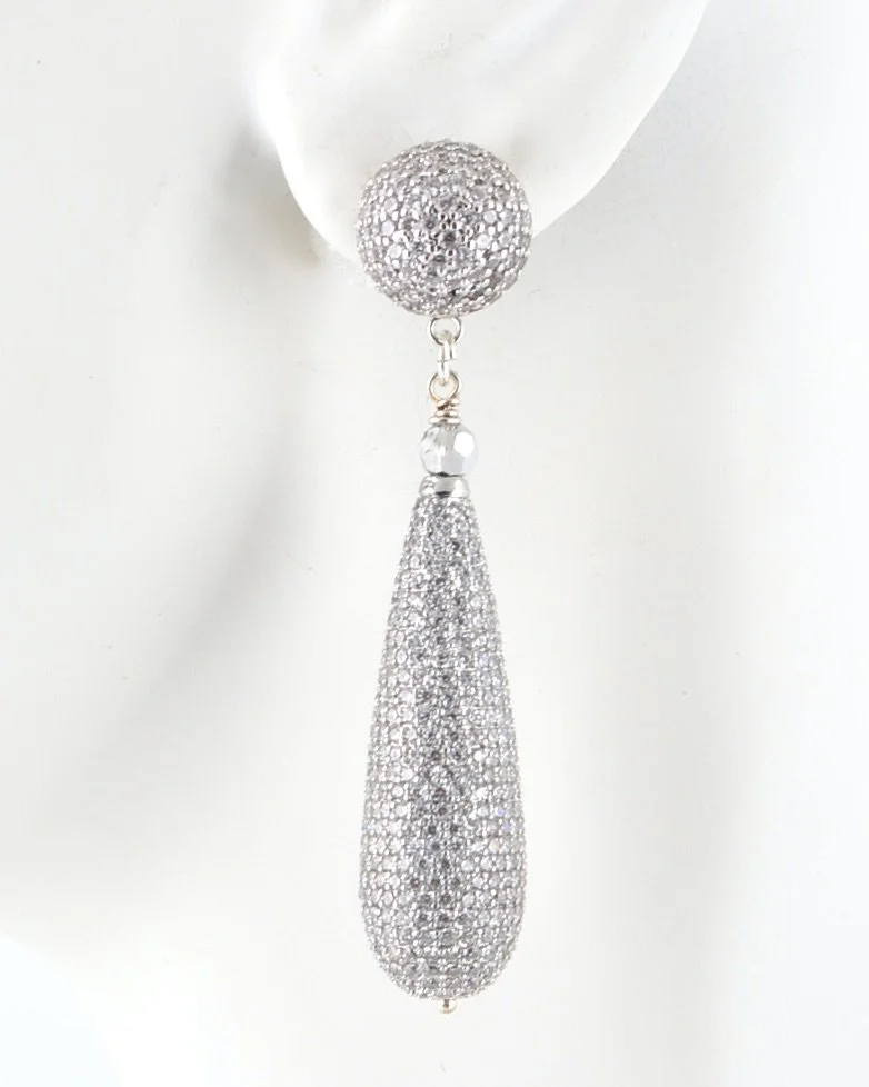 Silver plated crystal cubic zirconia micro pave pierced round button earring top with three interlocking pave chain links ending in a pave tear drop. Earrings are a classic silver micro diamond look. Earring measures 2.1/4” long by .5” wide.