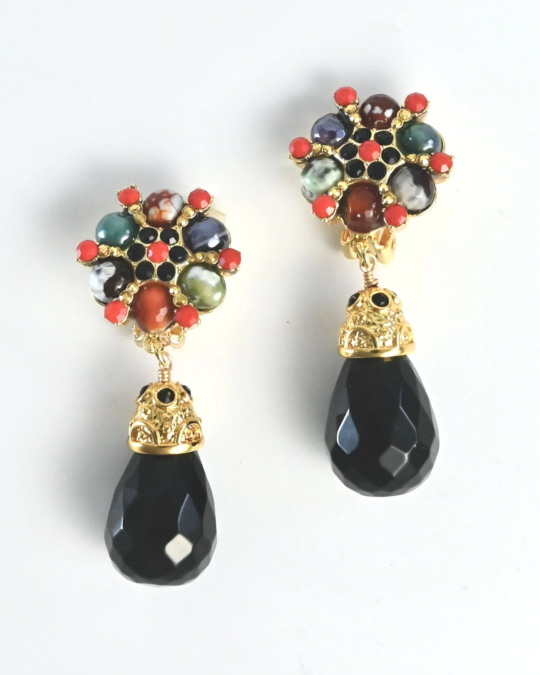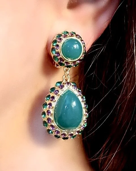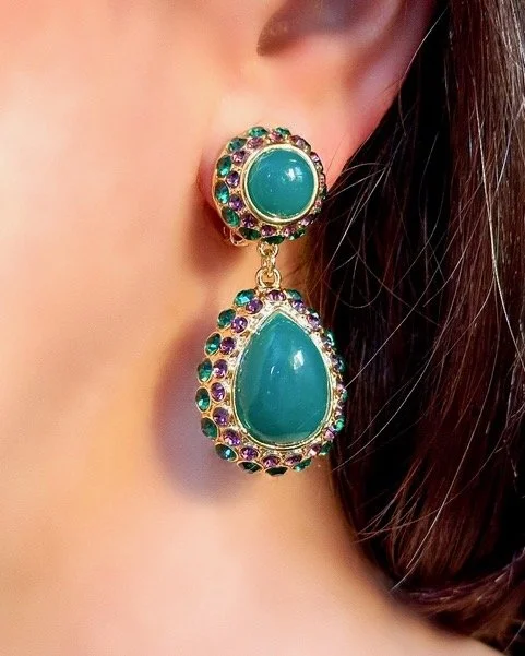 Bezel Clip With Etched Glass Stone Teardrop Clip Earrings ( Color Options)