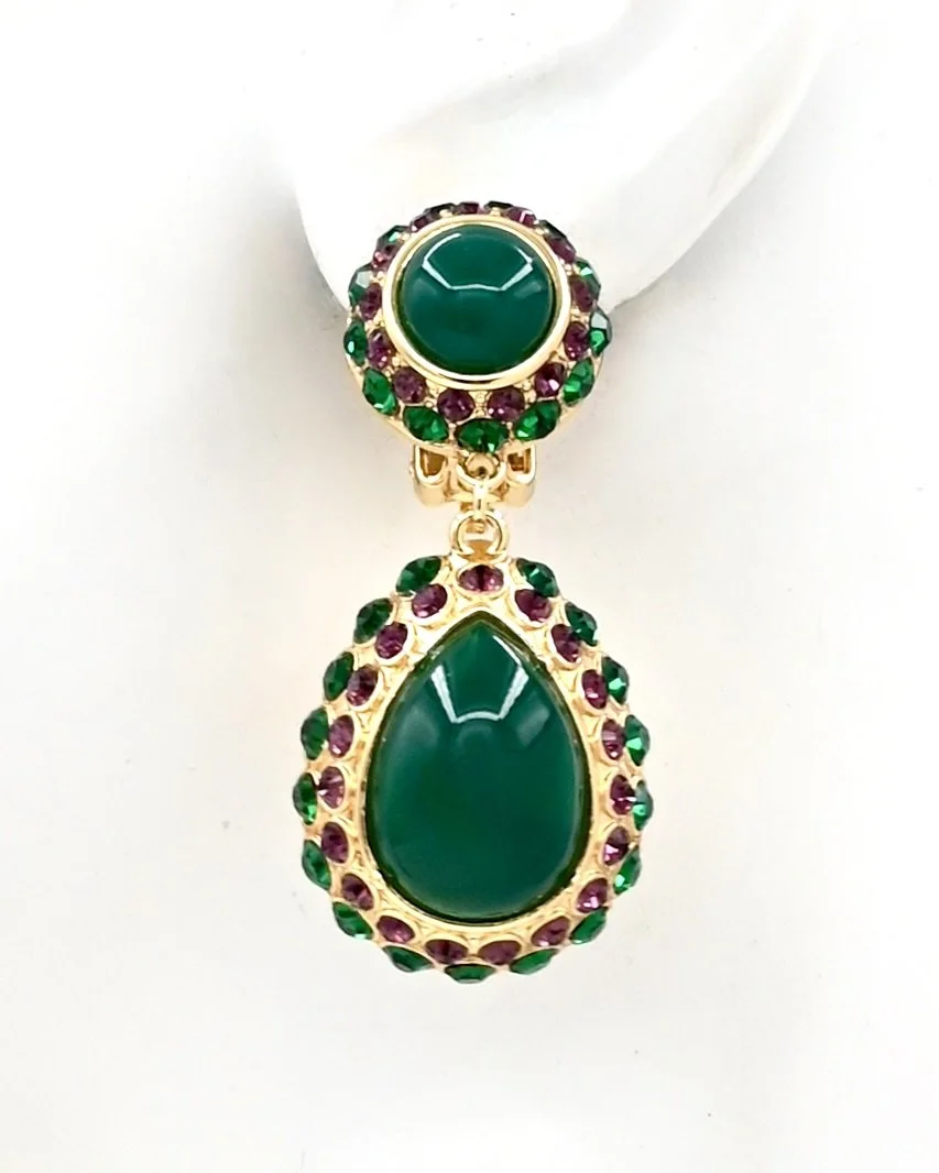 24 kt gold plated teardrop earring featuring an etched texture and set with a center glass teardrop cabochon stone suspended from a domed and sculpted clip featuring a large glass center cabochon stone set into an intricate open work bezel . Earrings measures 2.5 ” in length and 1.5 ” in width.