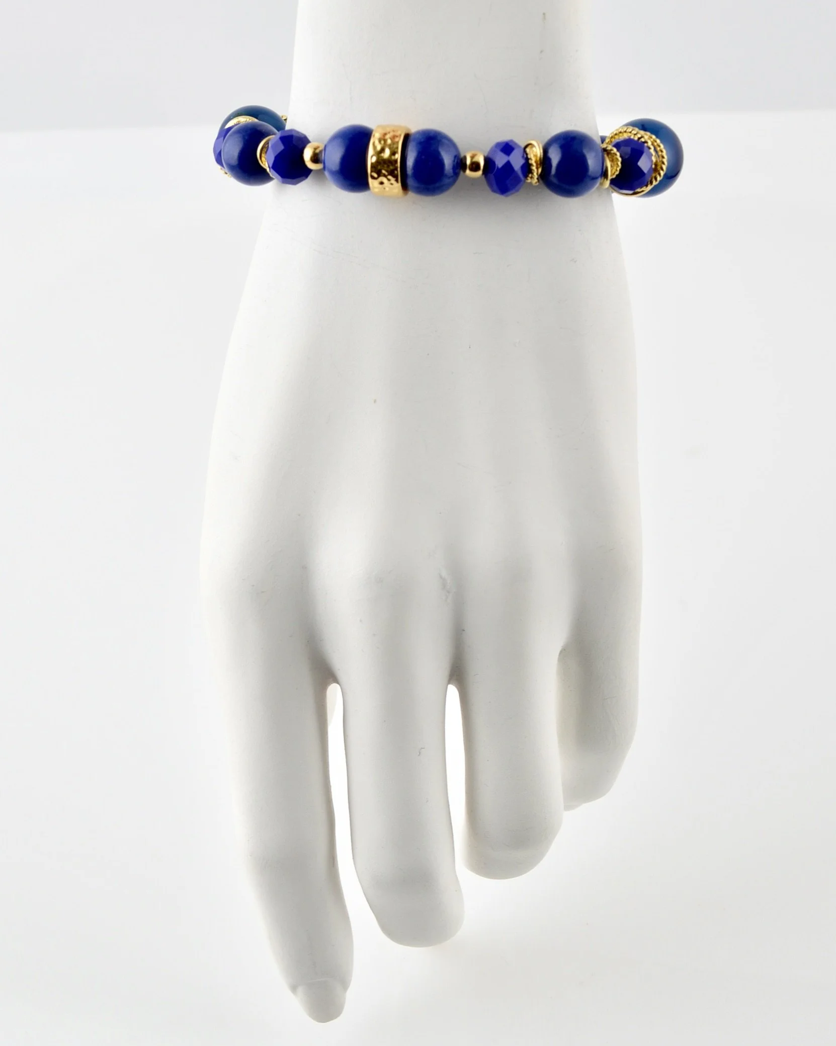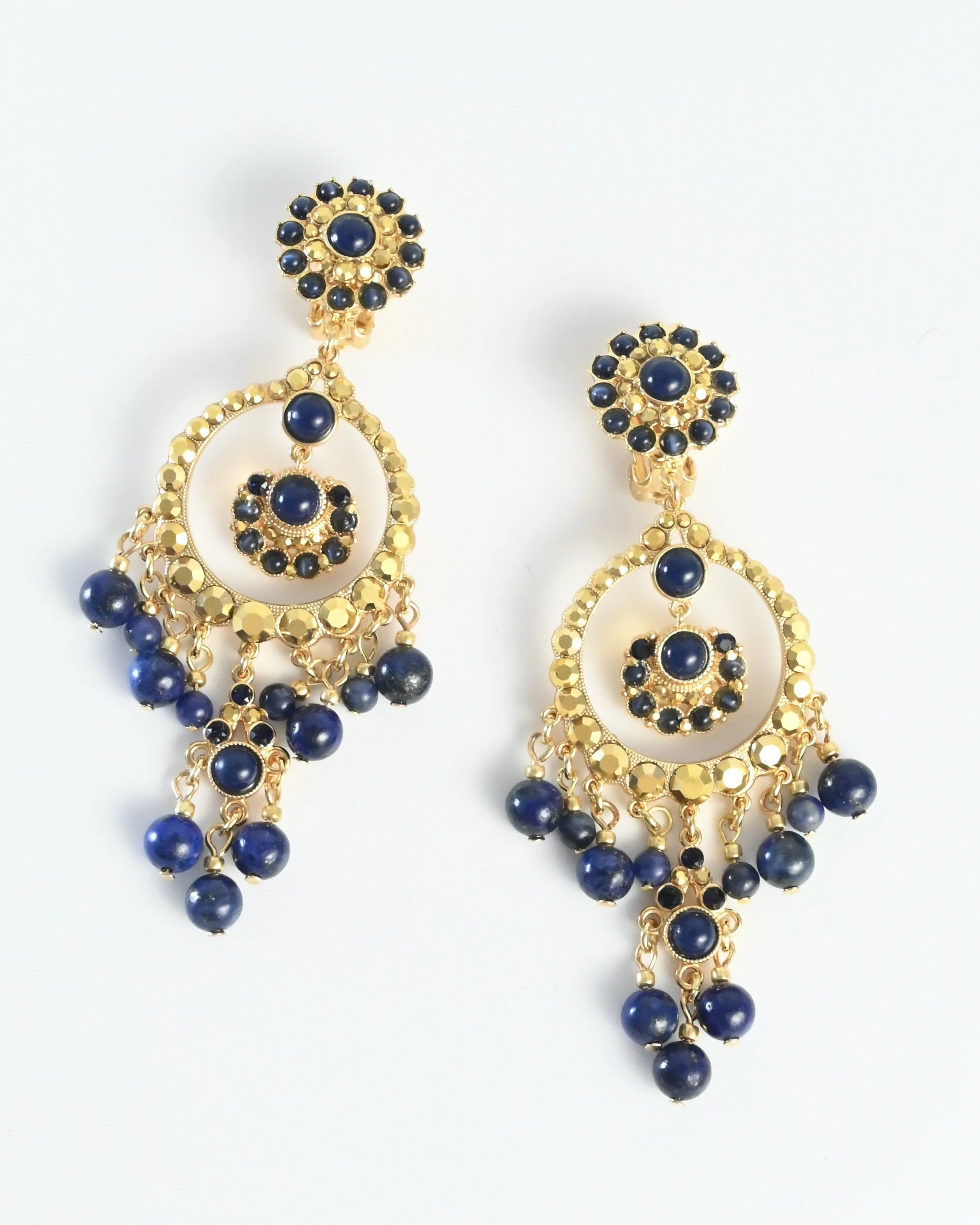 24 karat gold plated domed and sculpted clip earrings featuring a large navy blue sodalite center cabochon set into an intricate open work bezel clip suspending a faceted dyed navy agate stone teardrop. Earrings measure 2.5” in length. Due to natural stones matrix pattern may vary but will match as close as possible by pair.