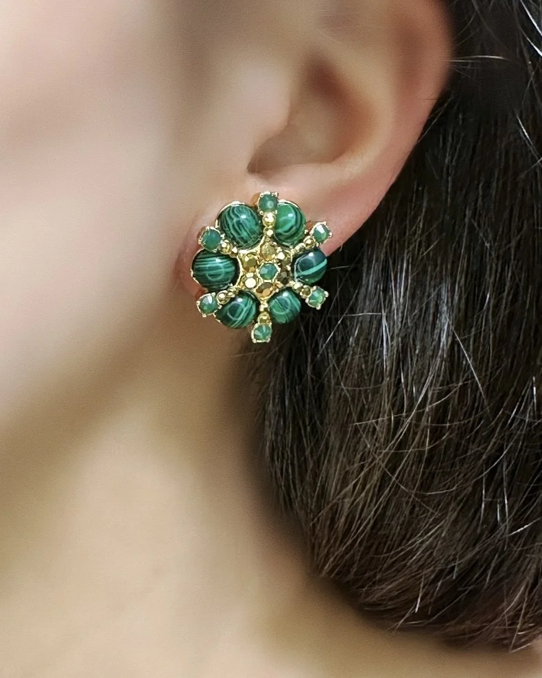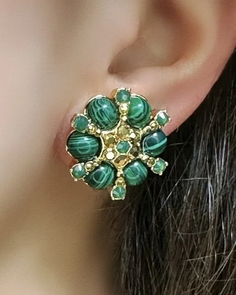 24 Karat gold plated starburst earrings with simulated green malachite beads, Austrian crystal stones in green opal and gold with a gold textured cap suspending a faceted simulated malachite large bead drop. Earrings measure 2.1/4” long