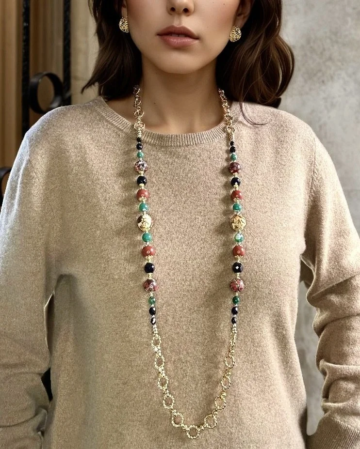 Five-strand twist necklace made of a mix of faceted carnelian beads, rust black and white striped faceted agates, brown and white round and coin shape leopard print fire agate beads, coin pearls, green jade, mustard color agates and glass beads in jet black, gold and copper colors. The Necklace measures 18.5 ” long with a 3” chain extender.