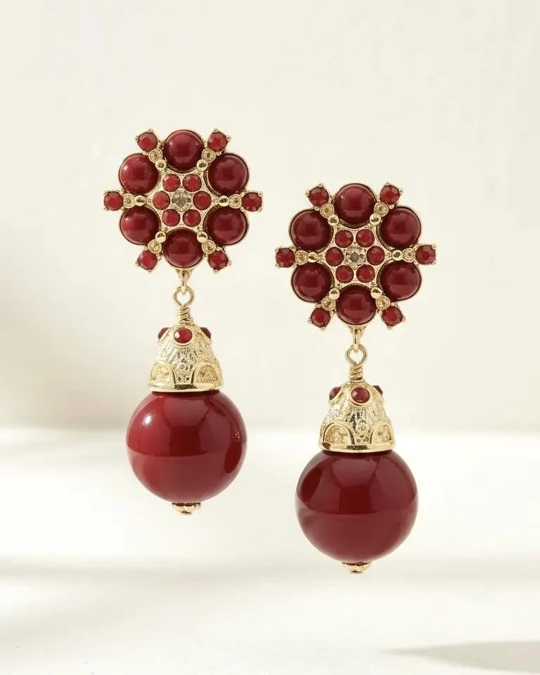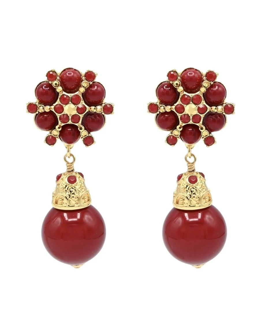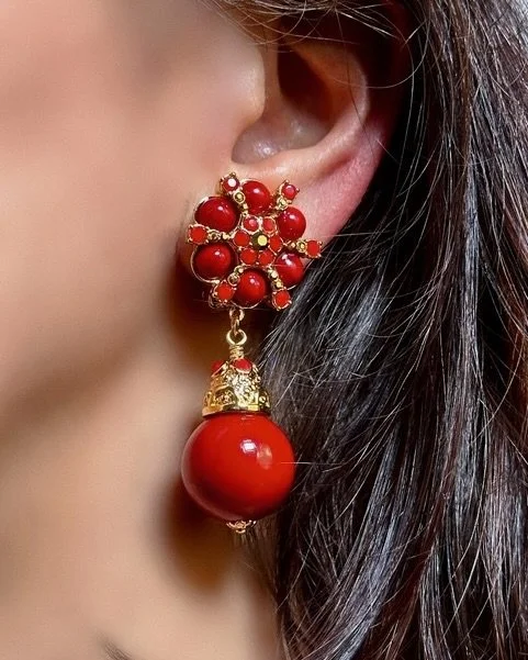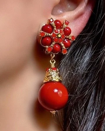 24 Karat gold plate fan shape cascading linked chandelier earrings made in a mix of bright and deep red Austrian crystal stones. Earrings measure 3.3/4” long and 1.5” at the widest part.Earrings are available with a filagree round clip or crescent design pierced post back earring top. Special custom colors may be requested by sending an email to info@larisabarrera.com