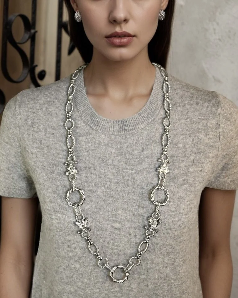 Discover timeless elegance with our rhodium silver plated detachable pendant pin and necklace. Versatile design meets exquisite craftsmanship for a must-have accessory. Three-dimensional filigree medallion pendant necklace set with hematite and silver crystal stones suspended from a silver plated brass cable chain and bail that features a double-ended clasp system to allow for various wearable lengths. The pendant can easily be removed from the bail and worn separately as a brooch. The pendant / brooch measures 2.5 ” in width and 2.5” in length. The chain is 34” long