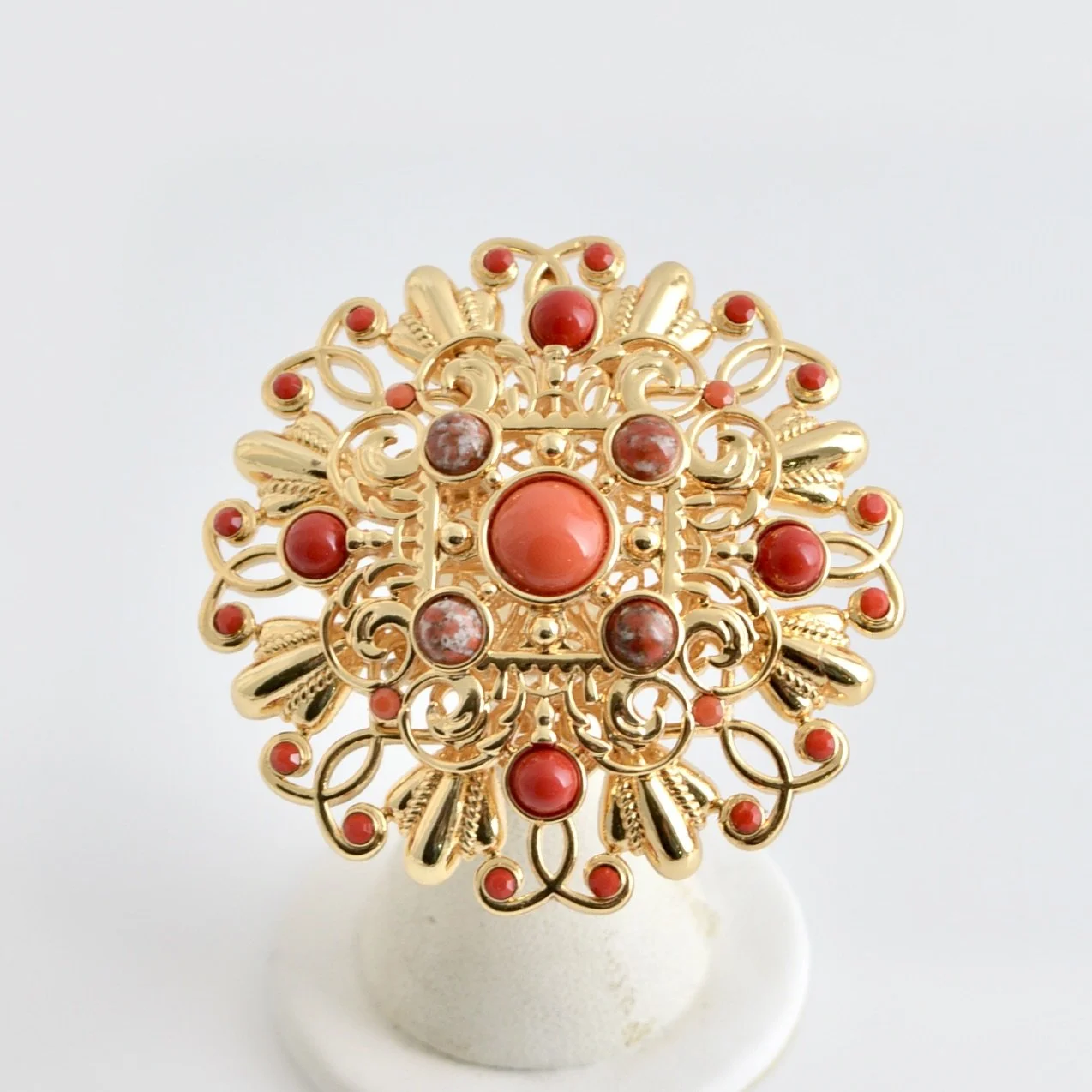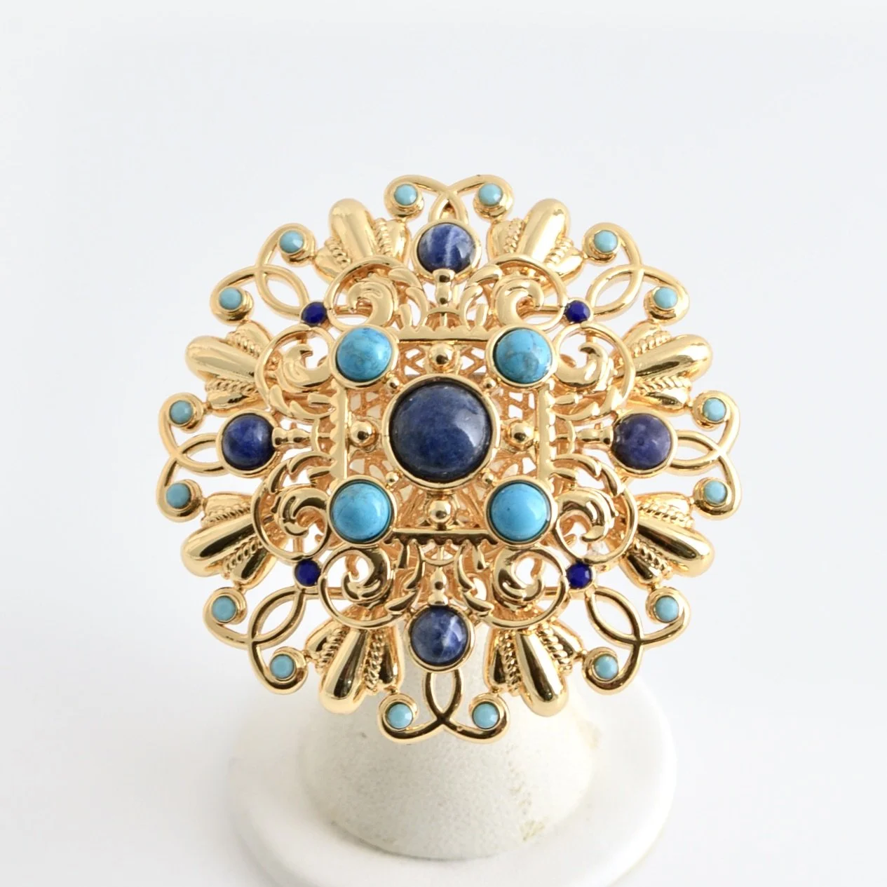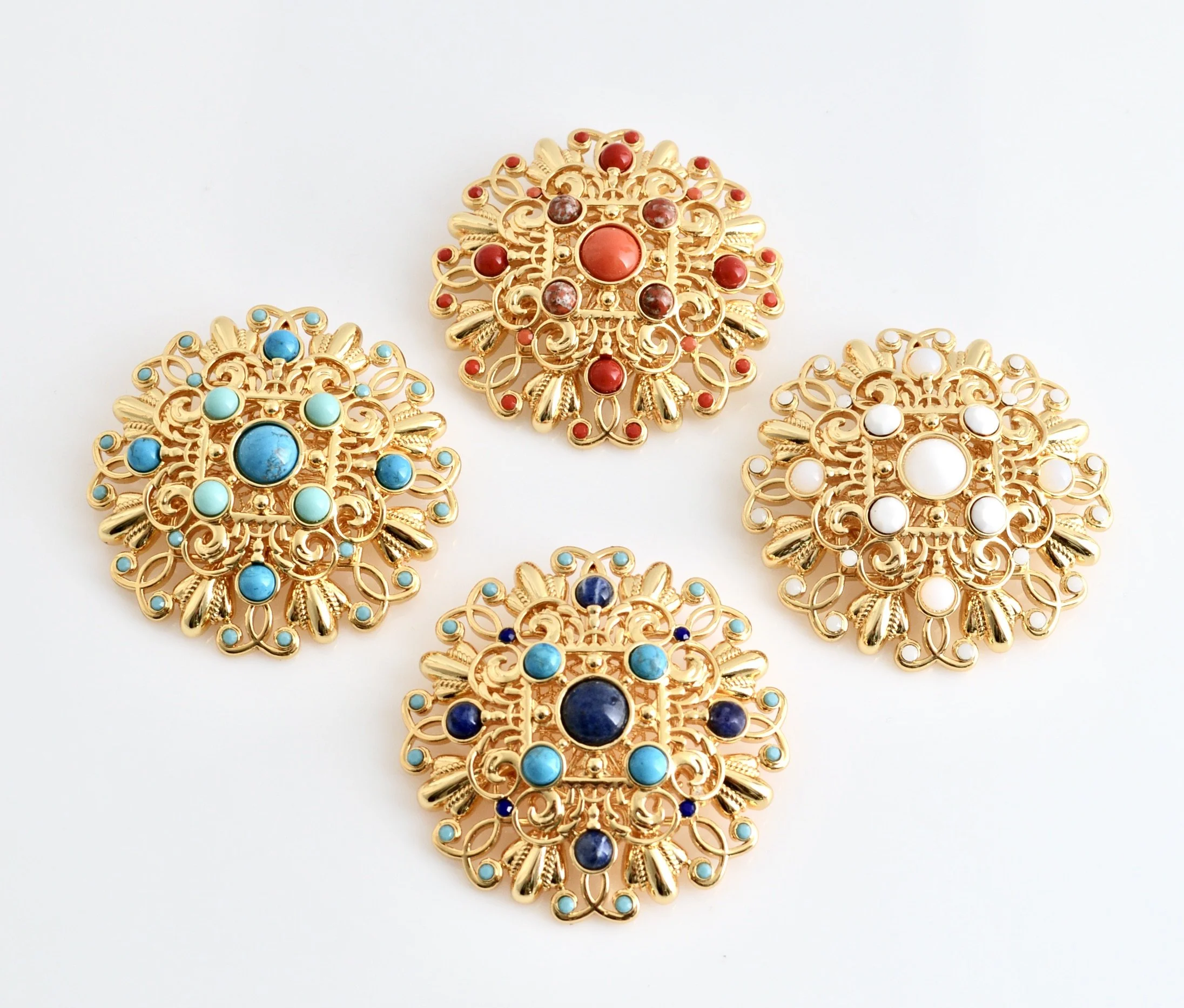24 Karat gold plated bold chain link necklace with LCB signature cast ornaments with cabochon stone settings and large cast twist link rings set with Austrian crystal stones and linked with brass twist chain. Stones are set on both sides of ornaments so necklace is a showstopper .