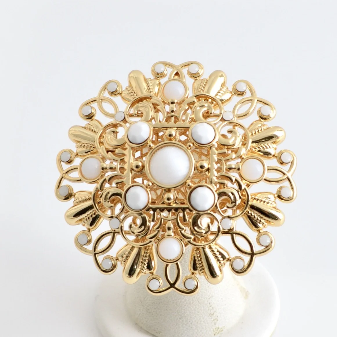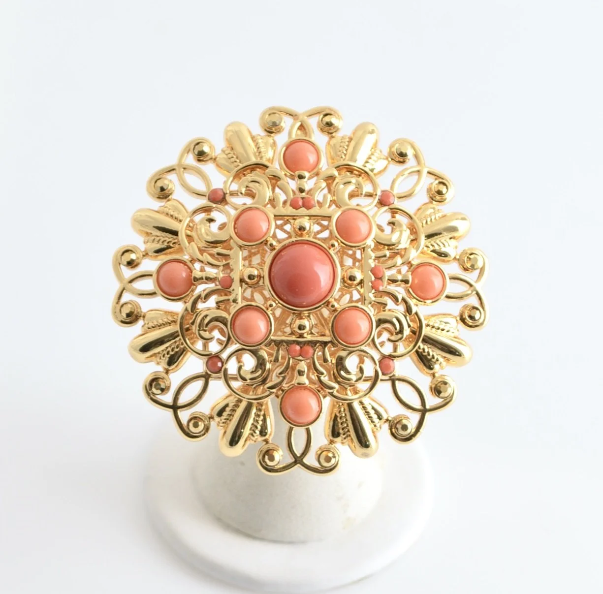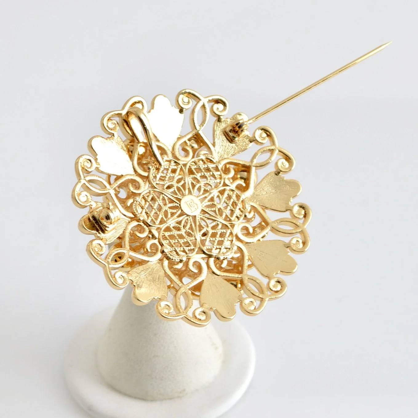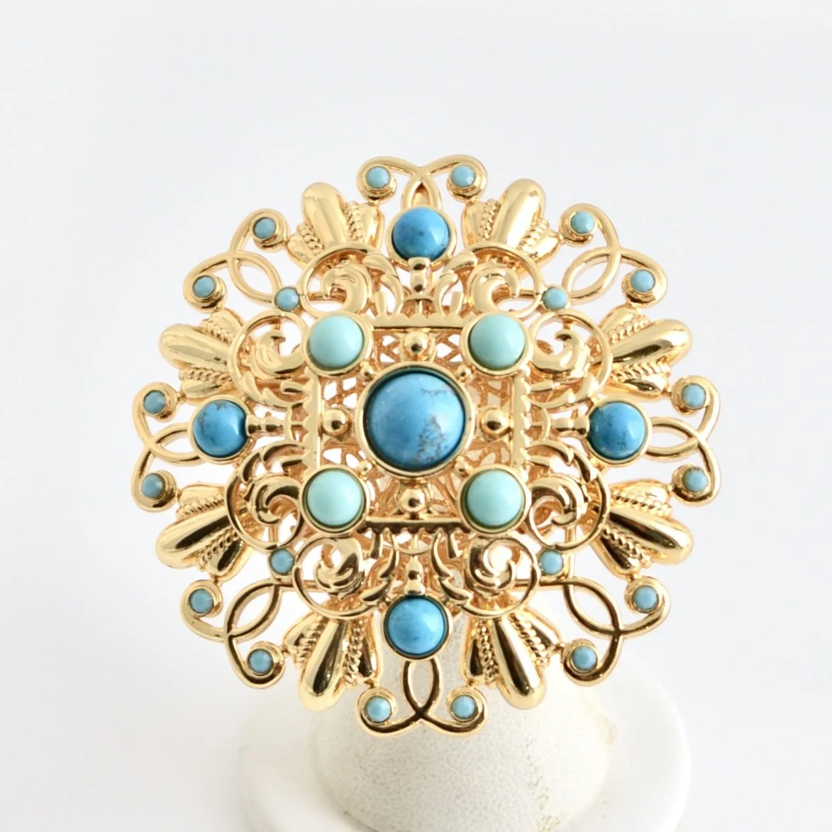 24 Karat gold plated bold chain link necklace with LCB signature cast ornaments with cabochon stone settings and large cast twist link rings set with Austrian crystal stones and linked with brass twist chain. Stones are set on both sides of ornaments so necklace is a showstopper .