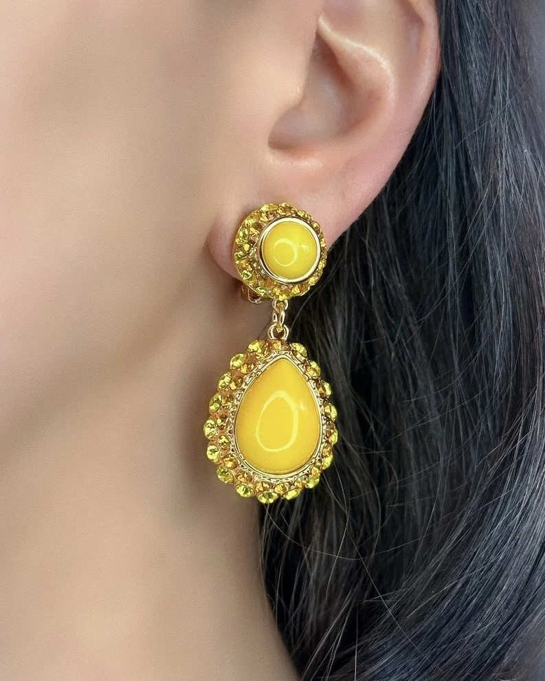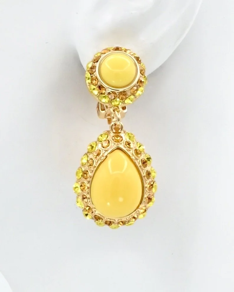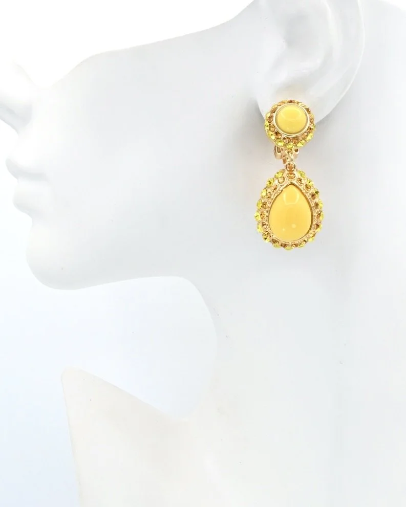 24 Karat gold-plated round earring Top and domed teardrops with center butter yellow stones edged with Topaz and Citrine Austrian crystal stones . Earrings are 1.7/8” long. Earrings are available with a clip backing or pierced with a center post back..