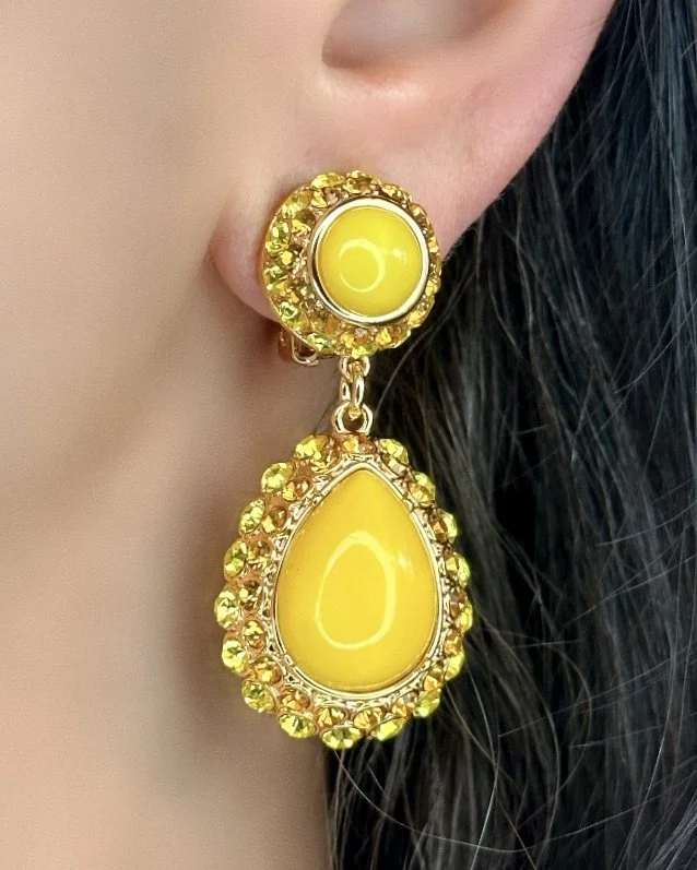 Butter Yellow Lucite Teardrop Earrings With Yellow Crystals Stone Edge (Clip or Pierced)