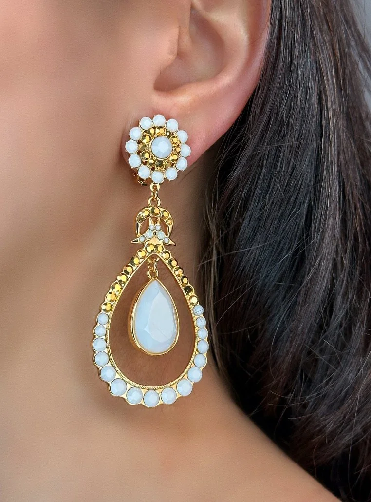 24 Karat gold plated starburst earrings with mother of pearl beads and Austrian crystal stones in white alabaster and gold colors suspending a 24 karat gold plated bead cap with gold plated hammered brass beads.. Earrings measure 2.1/4” long.