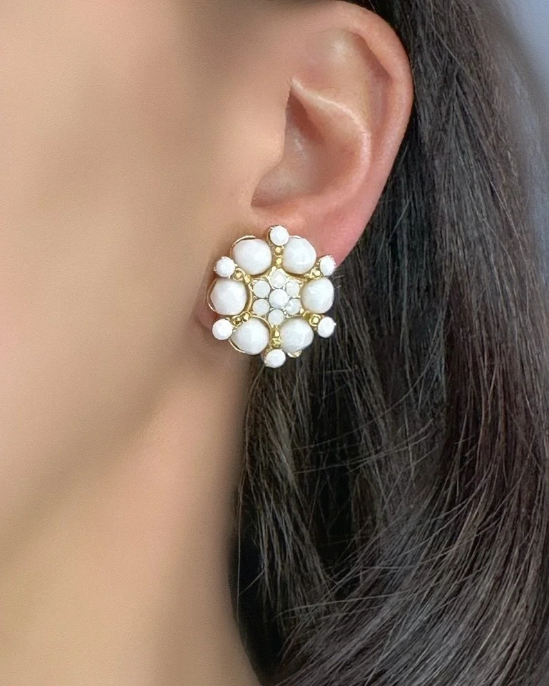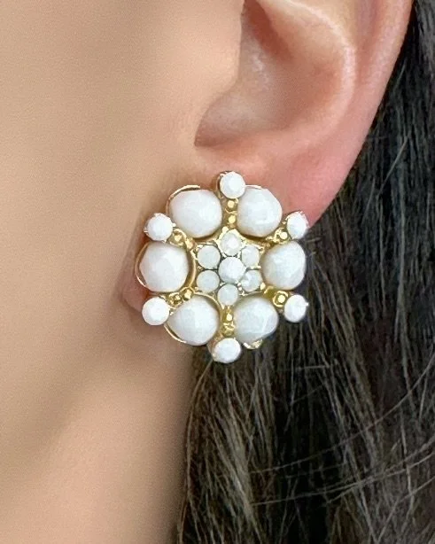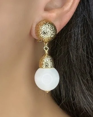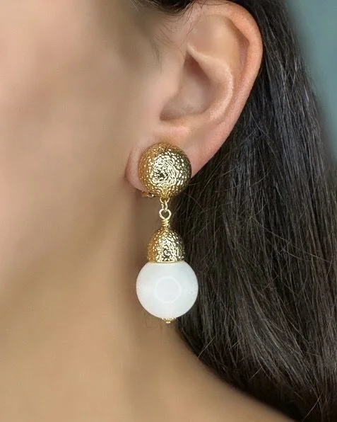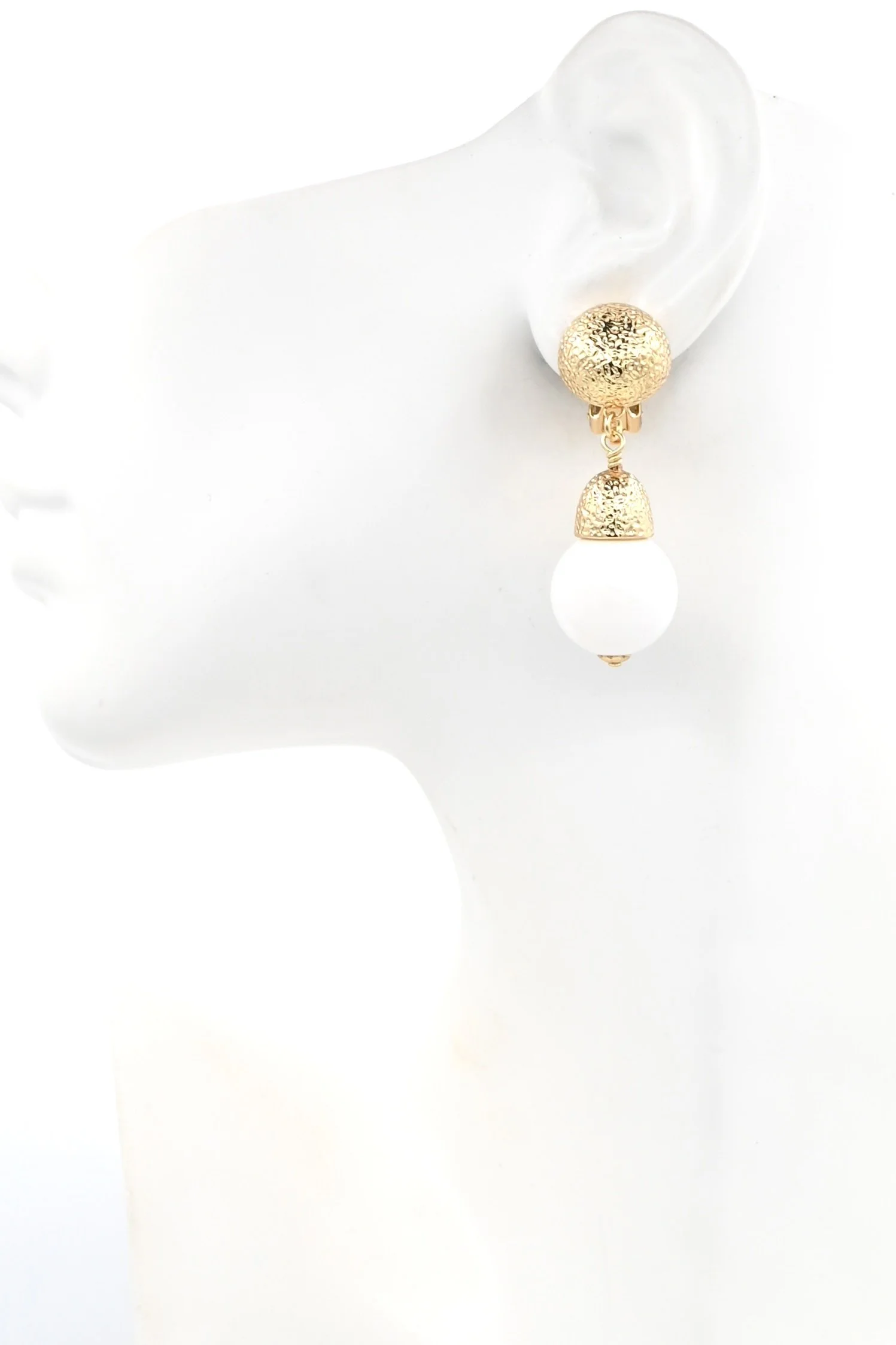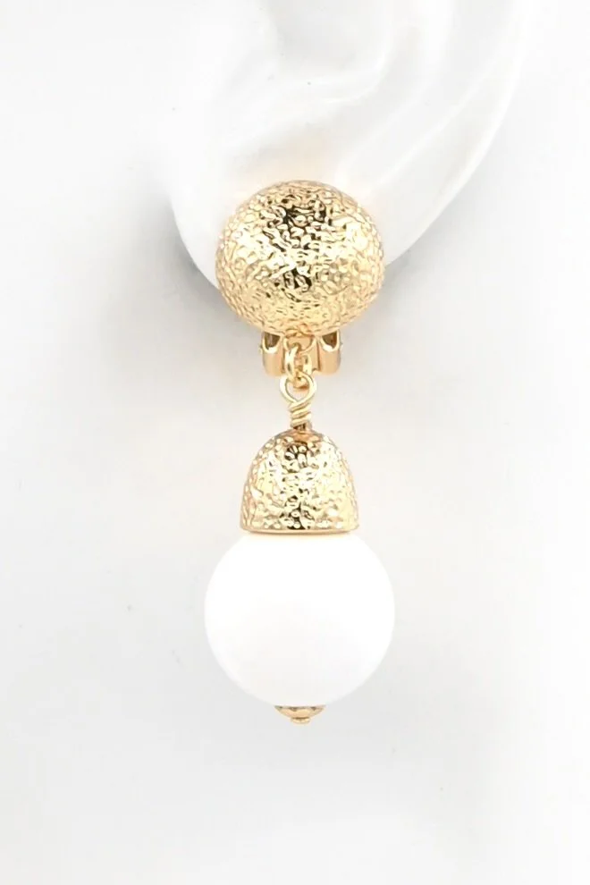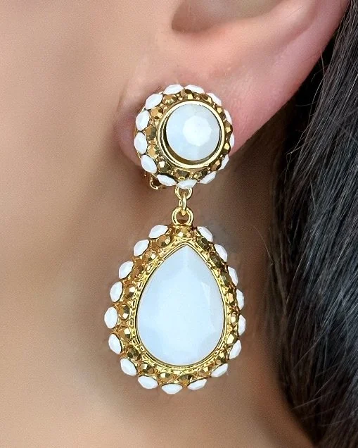 Simple and elegant design of a 24 Karat gold plated clip drop hoop earring set with a complete paved circle of white alabaster Austrian crystals on a textured and etched hoop and also surrounding the ear clip. Measures 2 3/4” in length and 1 3/4” in width. Also available in silver metal with white alabaster stones.
